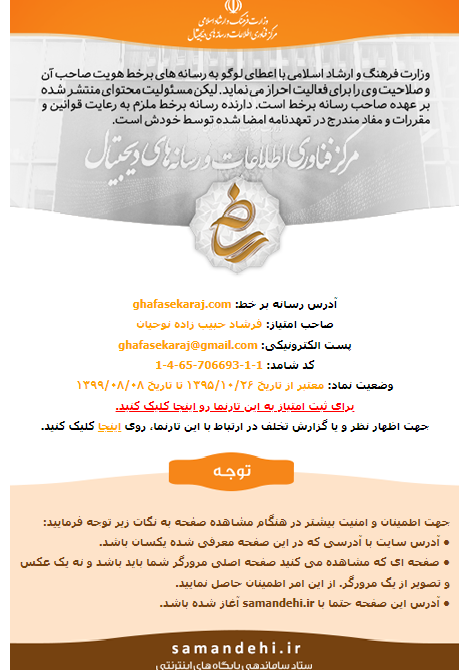 وزارت فرهنگ و ارشاد اسلامی با اعطای لوگو به رسانه های بر خط هویت صاحب آن و صلاحیت وی را برای فعالیت احراز می نماید. لیکن مسئولیت محتوای منتشر شده بر عهده صاحب رسانه بر خط است. دارنده رسانه بر خط ملزم به رعایت قوانین و مقررات و مفاد مندرج در تعهدنامه امضا شده توسط خودش است. برای اطمینان و امنیت بیشتر در هنگام مشاهده صفحه به نکات زیر توجه فرمایید: